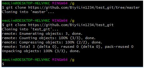 - 然后打开git bash,change directory到想要存放项目的位置(此处直接放到g盘),然后git clone 仓库的url,成功后,g盘出现了test_git文件夹,其中有.git隐藏文件(包含了所有的仓库信息)和在网页新建的1.cpp文件