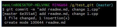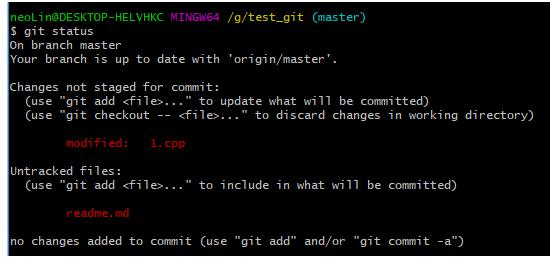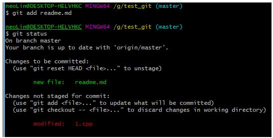 - 这里显示modified: 1.cpp, untracked files: readme.md,说明了修改了1.cpp,但是readme.md还未加到仓库中,根据提示,git add 命令添加。